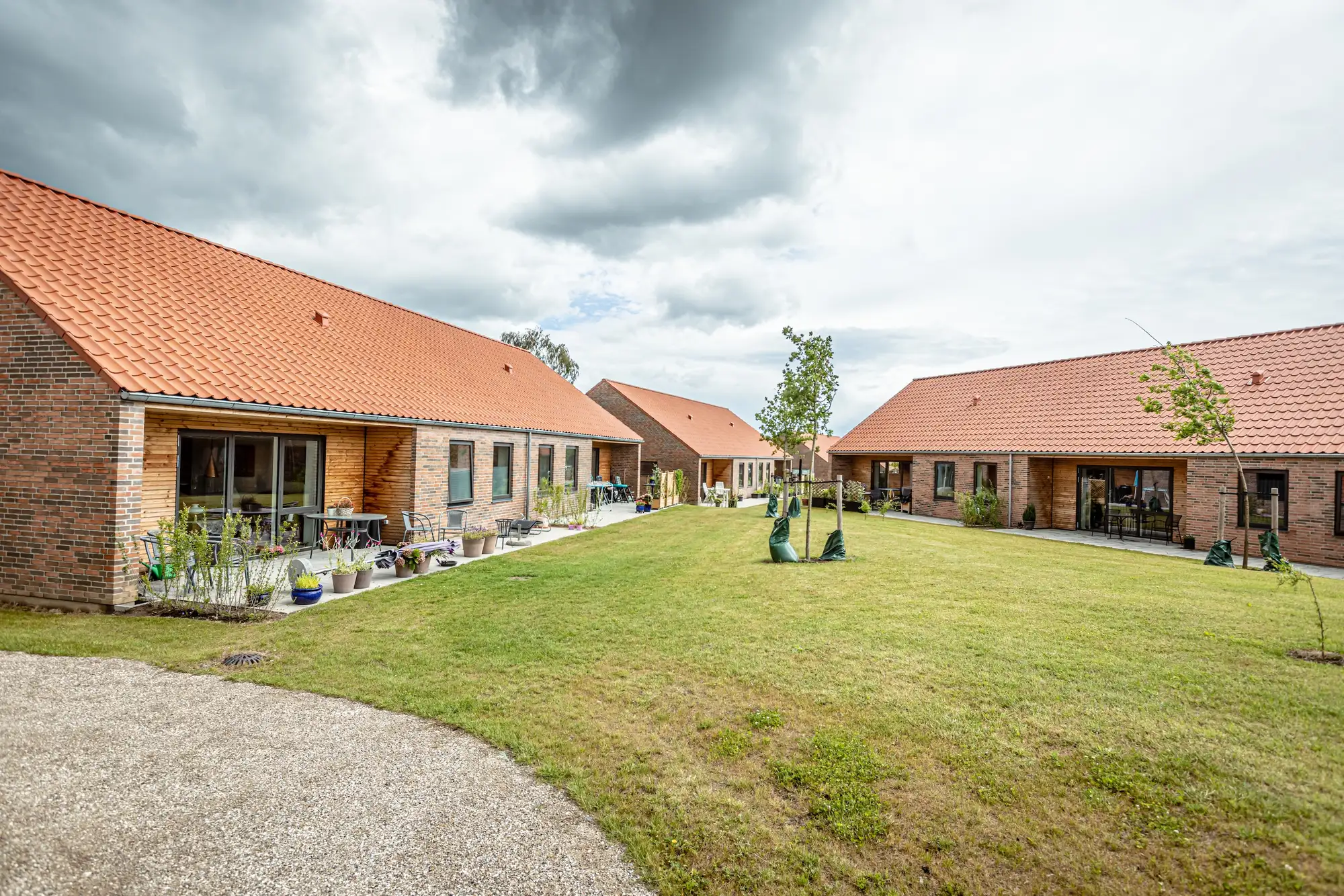 De 37 boliger er placeret i små huse med to til tre boliger omkring et grønt fællesareal, der giver bebyggelsen karakter af en lille landsby. Bygningerne opføres primært i tegl og træ, varme og naturlige materialer, som spiller smukt sammen med det kuperede terræn. Alle boliger er i ét plan, indrettet med fokus på tilgængelighed og udstyret med gennemlyste opholdsrum, private terrasser og funktionelle planløsninger, der gør det muligt for beboerne at blive boende længere i eget hjem.
